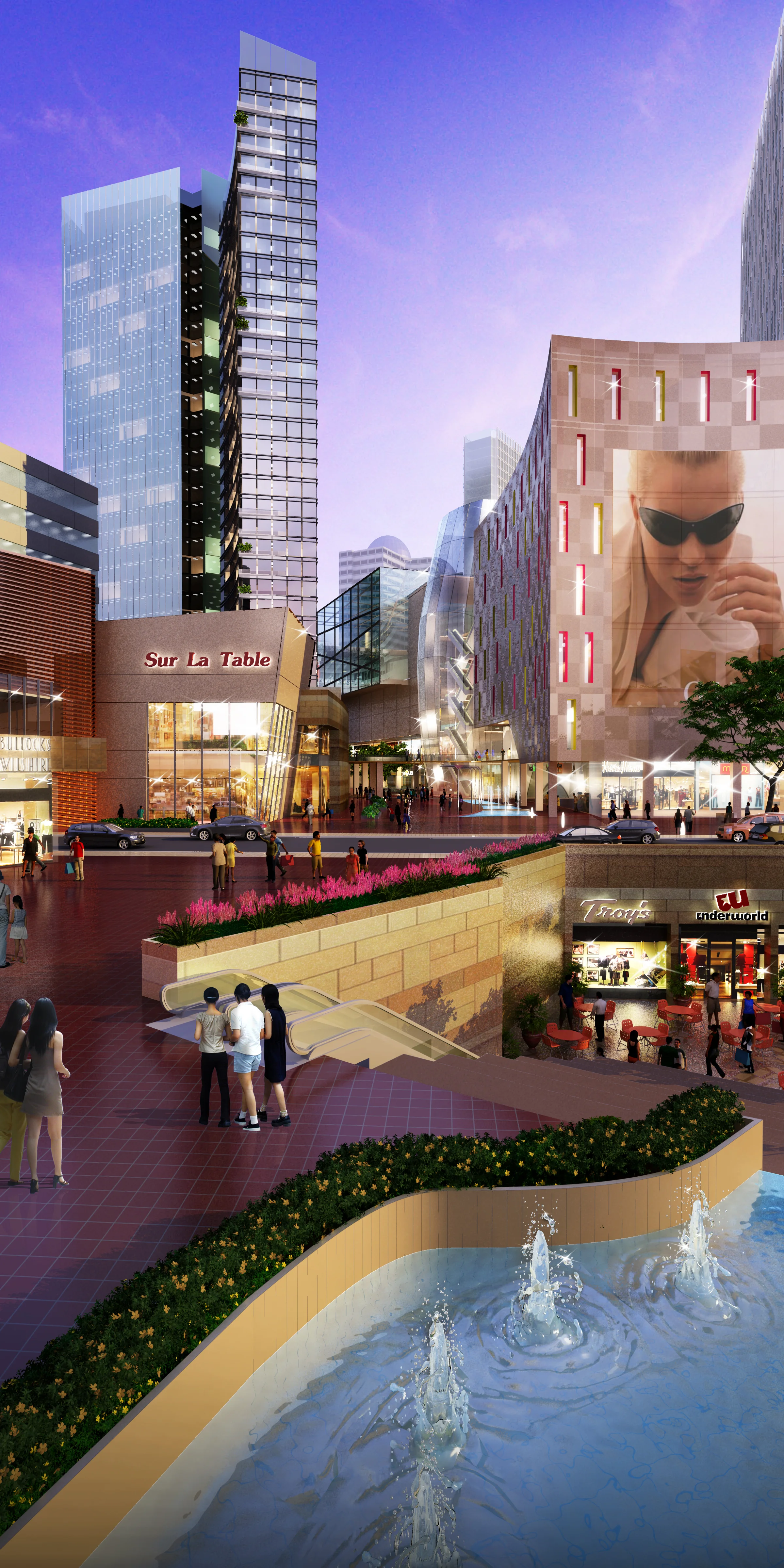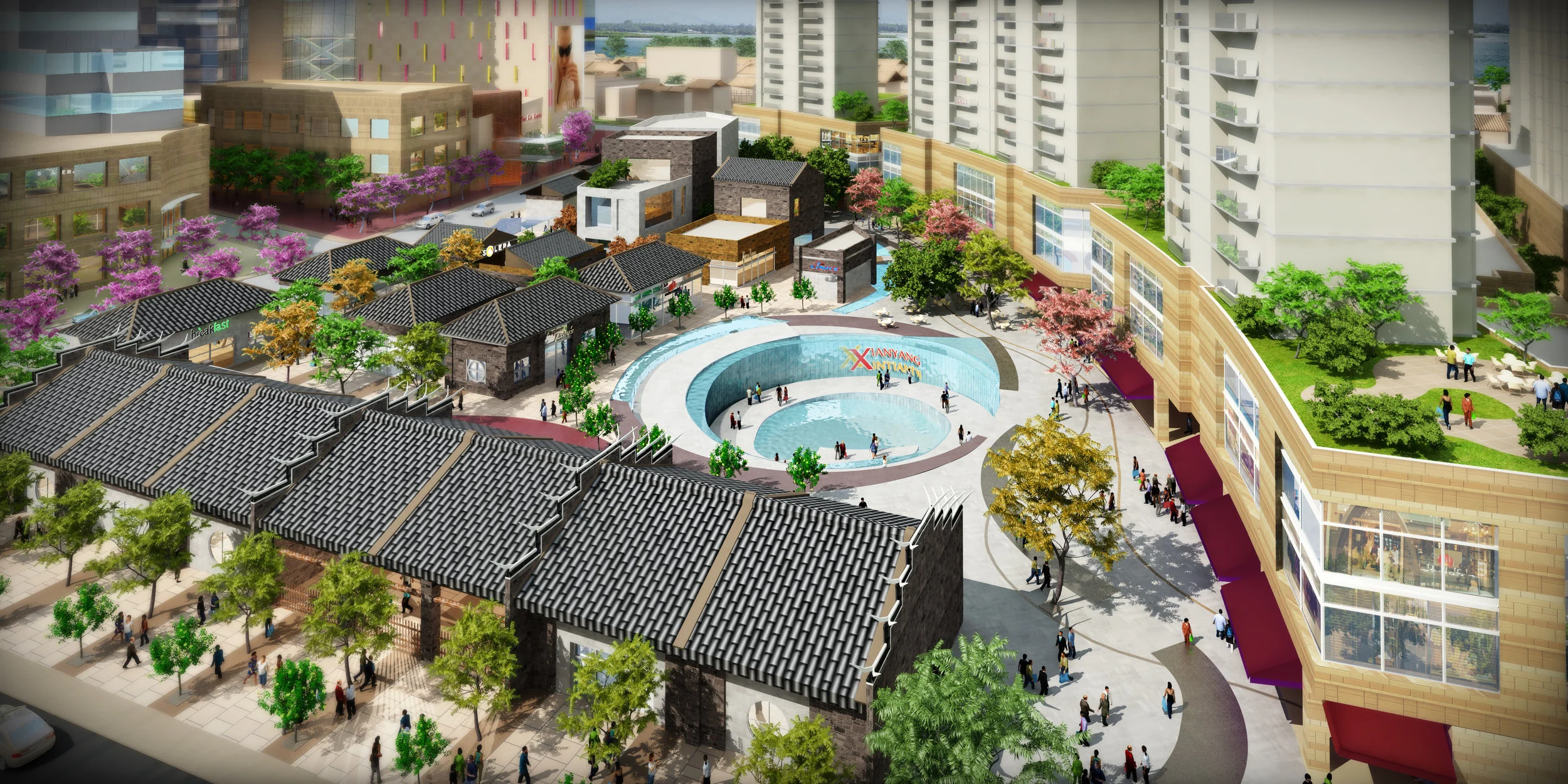 The Xiangyang Xintiandi Commercial Project is located in the commercial center of the Fancheng district in Xiangfan City, one block removed from the Hanjiang Pearl River. The two-block master plan connects a variety of uses, including low-rise and high-rise residential, historic preservation areas, offices and an enclosed shopping and entertainment center, linked by below-grade and ground level walkways.